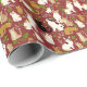 Papel de enrolar num padrão caprichoso de gatos em poses naturais, cercado por folhagem verde e flores, colocado sobre um fundo vermelho burgundy / marrom, criando uma estética encantadora e aconchegante