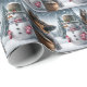 Um German shepherd vestindo um cachecol encara um bonitão alegre enfeitado com um chapéu e escarpa riscado em um fundo de paisagem nevada