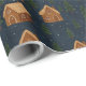 Wrapping paper with a cozy illustrated gingerbread village pattern on a deep blue background, featuring warm-toned houses, evergreen trees, and delicate snowy accents. The repeating design feels calm, nostalgic, and storybook-inspired.