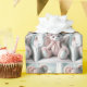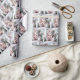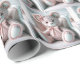 Um ursinho de pelúcia pincelado com um padrão de gingham rosa e branco sentado numa cadeira branca, elegante, enfeitada com um arco e pequenas flores no seu ouvido