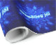 Um enxame de flocos de neve fractais azuis. O texto islandês que lê "Gleðileg jól" (Feliz Natal) aparece em azul e branco brilhantes.