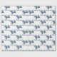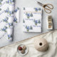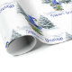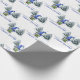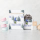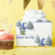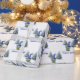 Gnomo azul bonito com uma árvore de Natal, flocos de neve e texto de saudações da temporada em branco.