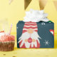 Isto são gnomos vermelhos de Natal bonitos segurando presentes, doces de Natal e Enfeites de natal com árvores de Natal e flocos de neve sobre fundo azul escuro. É oferta divertida para festas de Natal