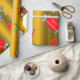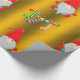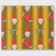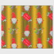 Um lindo padrão natalício de elfos (ou gnomos) de Natal com chapéus vermelhos e barbas compridas, desejando a todos um Feliz Natal. Eles estão espalhados sobre um fundo ouro, cercados por meias de Natal e saudações de Natal Feliz com canas doces.