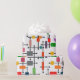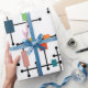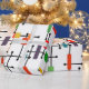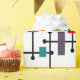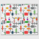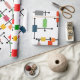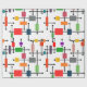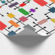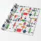 Este papel de embrulho tem um design moderno século médio de uma grande grelha de linhas pretas horizontais e verticais com retângulos coloridos.