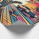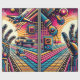 Use um padrão de grade de laser que desaparece no horizonte com elementos retro-futurísticos como mãos robóticas, carros voadores e chips de computador.