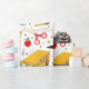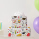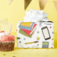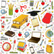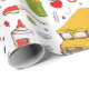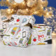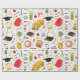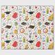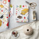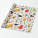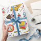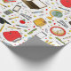 Papel de presente colorido com tema escolar e padrão de chapéus de graduação.