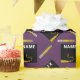 Graduação criativa decoração de presente e formando com bonés de formatura e lápis pretos e dourados sobre fundo roxo. Editar texto para adicionar o nome do formando e o ano de classe do mais velho.