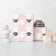 Este papel de embrulho tem um padrão de arco cor-de-rosa com bonés de formatura pretos.