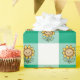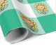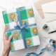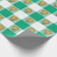 Adorable, whimsical green and white gingham pattern wrapping paper with cute yellow sunflowers with happy faces in each of the light green squares.
