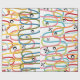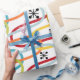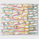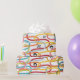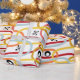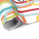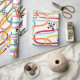 Este papel de embrulho tem uma design moderna do século médio de rabiscos rodando verticalmente em cores retrógradas com estrelas pretas e círculos espalhados sobre a design.