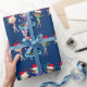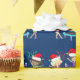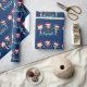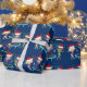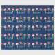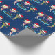 Esta bela ginástica de papel de embrulho de Natal mostra 3 gymnast bonitinhas vestindo chapéus de Papai Noel e segurando uma pose com fitas em um bonito fundo de férias azul. A loira está segurando uma fita vermelha, a morena está pulando em um trampolim, e a moça africana americana está segurando uma fita verde.