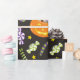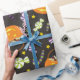 Este papel de embrulho bonito do Halloween apresenta traços ou lanternas de jack o' cheias de doces em fundo preto com vários doces. Perfeito para embrulhar seus presentes e guloseimas.