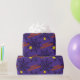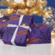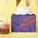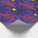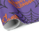 Este papel de embrulho adorável para o Halloween tem teias de aranha e aranhas sobre um fundo roxo. Orange Happy Halloween.