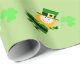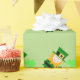 Um pequeno duende feliz está segurando um trevo irlandês sobre um fundo verde. Clique em "Personalizar" para alterar a cor do plano de fundo; se desejar.