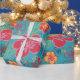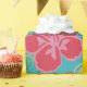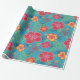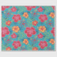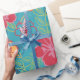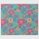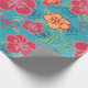 Flores coloridas de hibisco floral em pinks e laranja com folhas verdes, o Havaí inspirou um padrão em fundo azul.