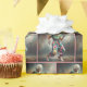 Uma idosa alegre está dançando e rindo, vestindo um par de óculos escuros em forma de estrela e roupas vibrantes e coloridas