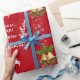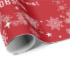 Papel de embrulho de Natal moderno, engraçado e fofo, com uma imagem de um unicórnio puxando Papais noeis para trenó (cheio de presentes), os textos "Ho ho hoh querido, que ANO!" + "Aqui está para um mais feliz!" + "Feliz Natal!" e um nome personalizado. Com borrachas de flocos de neve brancos e prateados e dois pares de sinos de Natal com primavera de holly, sobre fundo vermelho de Natal. Certifique-se de personalizar pelo menos o nome.