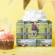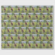 Uma vaca que veste uma bandana vermelha é empoleirada sobre uma cerca de madeira em um pasto verde e exuberante
