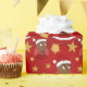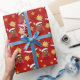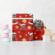 Papel de embrulho de Natal com uma ilustração de feliz sorriso de um homem afro-americano com o chapéu de Papai Noel; com modelo de texto editável; design de Natal com um fundo vermelho sem costura com estrelas