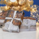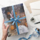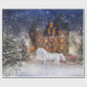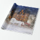 Um cavalo fica numa paisagem de inverno perto de uma casa e um trenó de Natal. Uma fotografia de natal fantástica para todos os amantes de cavalos!