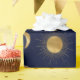 Este design de galáxia moderno apresenta falsas representações douradas do sol, lua, planetas e nebulosa contra um fundo marinho-azul. A design inclui uma lua crescente de ouro, um sol dourado vibrante com raios solares, um planeta Terra ouro e azul, um Saturno de ouro amarelo e seus anéis, e representações pintadas à mão de Vênus, Júpiter e Marte em tons de rosa, ouro rosa e ouro amarelo. A estética geral é um tema de universo inspirado na Boêmia com elementos celestes do espaço.