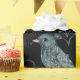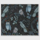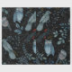 Intricate pattern of blue birds and an owl, adorned with floral and paisley designs on a black background, conveying an elegant and whimsical tone.