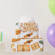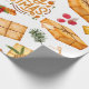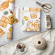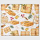Este papel de embrulho com visual retrô apresenta presentes embrulhados em papel marrom juntamente com pauzinhos de canela, pinheiro e frutos, fitas e etiquetas de presente.