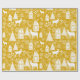 Este pacote de papel de embrulho moderno apresenta um design moderno com vários motivos natalinos: Árvores de Natal, casas, chuvas, cana-de-açúcar, flocos de neve, ramos e a palavra Joy em branco sobre fundo de ouro amarelo.
