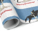 Diversão de papel de embrulho equestre mostrando um cavalo e um cavaleiro pulando seu cavalo na neve e saudando o Feliz Natal.