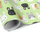 Um padrão repetido de 4 diferentes raças de coelhos bonitinhos num fundo verde para Primavera e Páscoa.