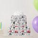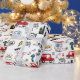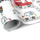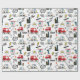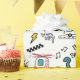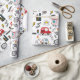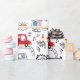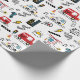 A playful, cartoon-style city pattern featuring buses, cars, helicopters, traffic lights, buildings, and fun doodle text like “Beep Beep,” “Wuz Up?” and “Go,” in bright red, yellow, blue, and black tones.