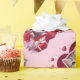 Um gatinho fofo com olhos brilhantes senta numa caixa vermelha cercada por flores, corações e presentes. Perfeito para temas de amor, Dia de os namorados e animais adoráveis.