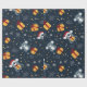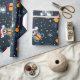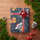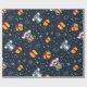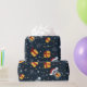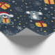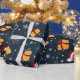Papel festivo alegre de embalagem com um padrão de coalas fofinhos e caixas de presentes coloridas num fundo preto.