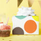 Este papel de embrulho tem um design geométrico de pontos azuis, laranja, amarelo e castanho.