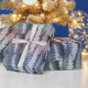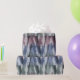 An illustration of layered pine trees arranged in horizontal bands, featuring cool pink, blue, and grey shades.