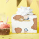 Chá de fraldas de beisebol bonito ou presente de primeiro aniversário apresentando um garotinho em um boné de beisebol e um ursinho grande sentado em um campo de beisebol.