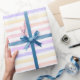 Este papel de envolvimento moderno caracteriza listras da aguarela em uma paleta dos pastels, do rosa, do amarelo, da lavanda e do azul. Aperfeiçoe para o papel de embrulho para toda a ocasião ou para o papel que crafting incluindo o decoupage. Projetado pelo ©Tim mundialmente famoso Coffey do artista.