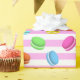 Macarões coloridos sobre fundo listrado rosa e branco.
