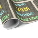 Este divertido design de papel de embrulho com tema de aniversário apresenta uma mensagem como "FELIZ 34º ANIVERSÁRIO, NOME AQUI!", onde o nome pode ser personalizado. O fundo apresenta um padrão de aparência rústico, castanho e falso em grãos de madeira. O texto da mensagem personalizada apresenta cores como azul, amarelo e verde, e tem uma aparência inspirada pela das letras pintadas e estêncilhadas. Um papel de embrulho como este poderia talvez ser usado para embrulhar presentes de aniversário que são dados a alguém que comemora seus trinta e quatro anos de aniversário. [~Z0000293]