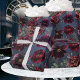 Um papel de embrulho de joia azul marinho com uma sinfonia de peões vermelhos de framboesa bordéus profundos adornados com spray de ouro e borbulhando contornos de ouro se reúnem contra um fundo azul marinho pintado a aquarela.