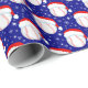 Este papel de embrulho de Natal apresenta almôndegas vestindo Papais noeis de chapéu com flocos de neve girando sobre um fundo de marinho de Natal.