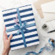 O marinho Blue and White Striped Wrapping Paper apresenta listras azuis e brancas escuras para tornar a apresentação do presente bonito, clássica e agradável. Funciona em todas as ocasiões. Veja o presente mais bonito em nossa loja em zazzle.com/TheRightNote para quando você quiser acertar a nota certa com seus cartões, presentes e outras papadas.