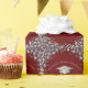 This modern design features a graduation hat and confetti in silver on a background of maroon with white text.