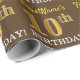 Este design de papel de embrulho apresenta uma mensagem como "FirstName’s 10th BIRTHDAY!", com o "10º" a ter uma aparência falsa/de cor dourada. O nome pode ser personalizado, e o fundo é castanho. Talvez possa ser utilizada quando se dá presentes para o décimo aniversário de alguém. [~Z0000180]
