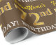 Este design de papel de embrulho apresenta uma mensagem como "FirstName’s 72nd BIRTHDAY!", com o "72º" a ter uma aparência falsa/de cor dourada. O nome pode ser personalizado, e o fundo é castanho. Talvez possa ser utilizada quando se dá presentes para o setenta e segundo aniversário de alguém. [~Z0000180]