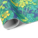 Papel de embrulho com padrão floral colorido, lindas flores de marigold, enormes folhas de burdock e botões de dandelion. Paleta de cores: ouro e amarelo-limão, turquesa, cor verde e azul. © Julia Khoroshikh www.juliakhoroshikh.art #floralstandard #marshmarigold #caltha #floralprint #wildflower #zazzlemade #wrappingpaper #giftwrapping #giftdecoration