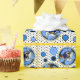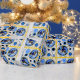 Brincadeira de Chanucá tem azulejos de preto em bolinhas brancas adornadas com sonhos, cornfloras azuis e medalhões apresentando a variação caprichosa de Leslie Sigal Javorek de uma personagem mais clara de Maxfield Parrish era Maxfield Lamplter com leggings de bolinhas, cobalto azul pancho, uma menorah totalmente iluminada em sua calçado , a saudação, "Feliz Chanucá" e tudo emprestado em amarelo-daffodil!