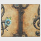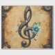 Mechanical clef and flowers to the beat of the clocks. A steampunk-style treble clef, rendered in dark metal with bronze accents and intricate detailing. The clef is adorned with blue flowers that have clock faces at their centers, adding a whimsical touch. Musical notes float near the clef, and small droplets hang from its curves.