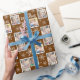 This Christmas gift wrapping paper will add a fun personalized touch to your gift giving. The design offers 4 square photo frames and the text: Merry Christmas on a dark brown or coffee colored background. The design is accented with whimsical snowflakes.